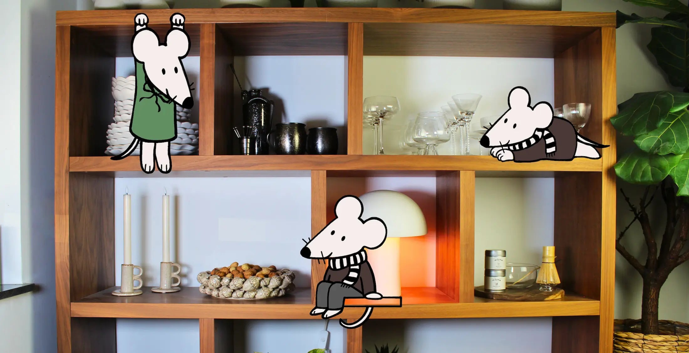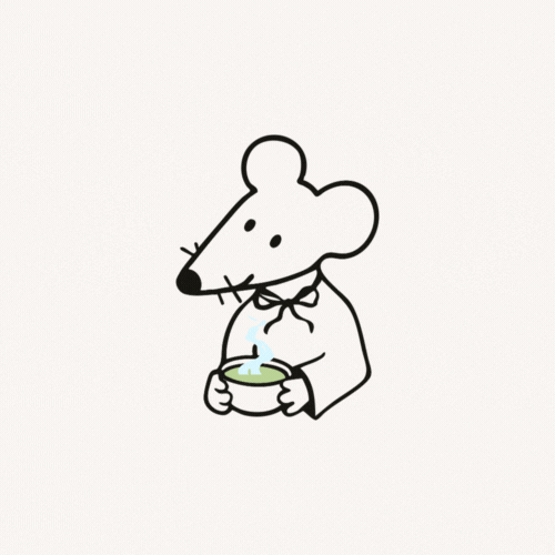 Mila, die kleine Maus, beginnt ihre Morgende mit einer dampfenden Schale Matcha, während Sonnenstrahlen durch die Blätter ihrer Zimmerpflanzen tanzen.